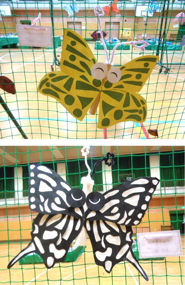 3年生は、色画用紙でチョウの羽の模様を表現した大きくカラフルな「世界で一匹のチョウ」です。防球ネットにとまるそれぞれのチョウは、羽の裏と表を見比べる楽しさもあります。