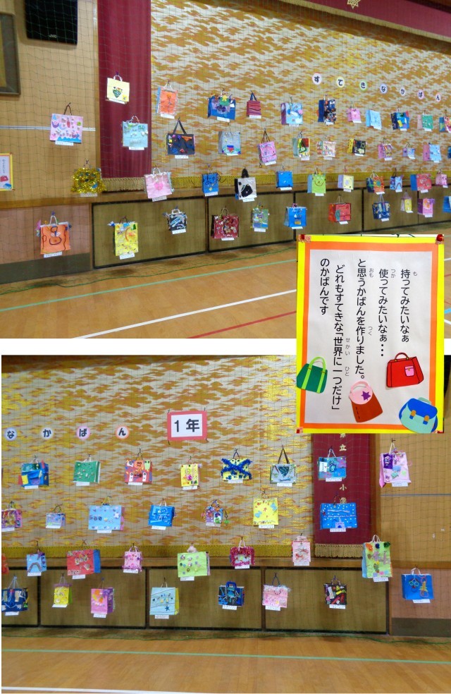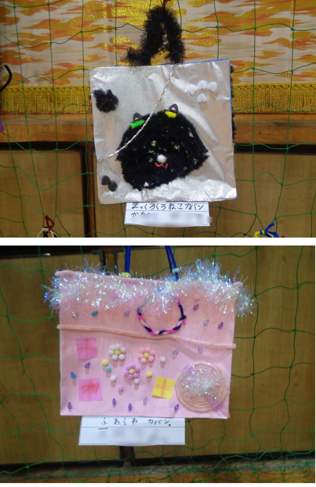 1年生は、紙袋に思い思いの素材で飾り付けをした「すてきな かばん」です。使っている素材と色使いに工夫があり、世界で一つだけのカバンに仕上がっています。