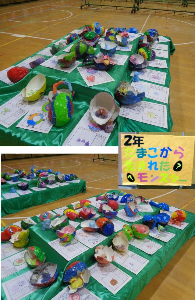 2年生は、膨らませた風船にのりと新聞紙で卵を作り、カラフルに卵の殻をデザインした「たまごからうまれた モンスター」です。殻の中から生まれてきた粘土で作ったモンスターもさまざまです。