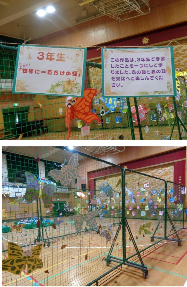 3年生は、色画用紙でチョウの羽の模様を表現した大きくカラフルな「世界で一匹のチョウ」です。防球ネットにとまるそれぞれのチョウは、羽の裏と表を見比べる楽しさもあります。