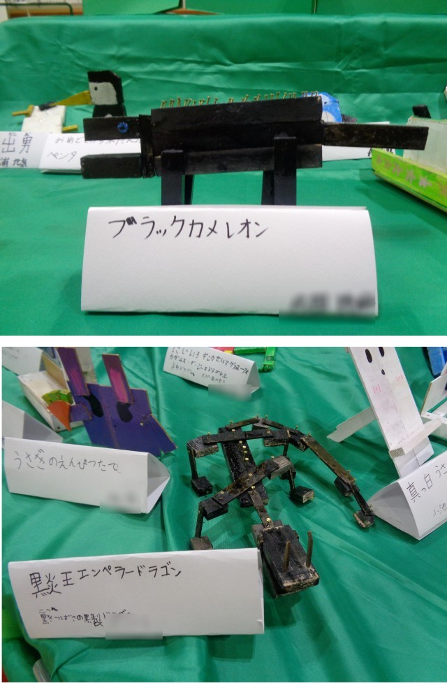 4年生は、木材を使って様々な動物を表現する「都島サファリパーク」です。釘を使って木材を組み合わせますが、時には釘も動物の体の一部として表現されています。