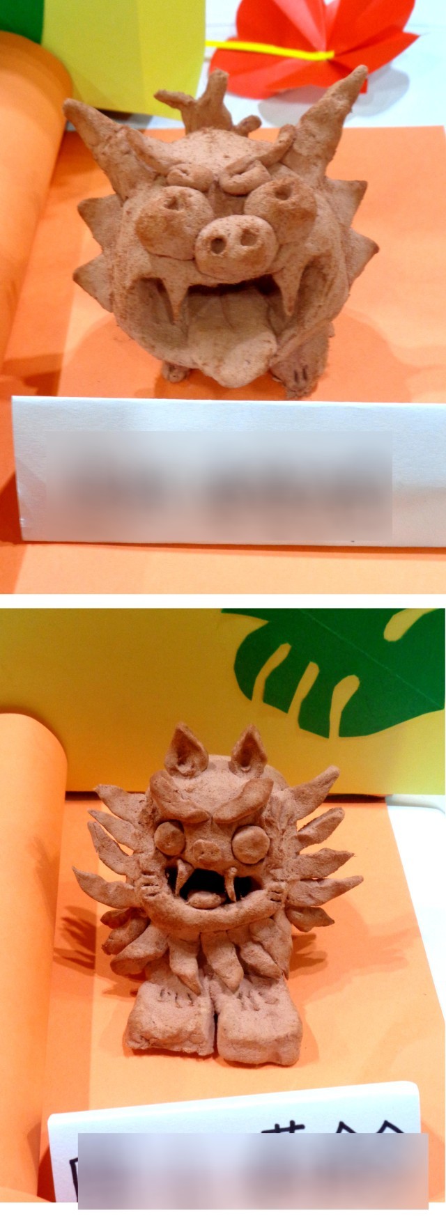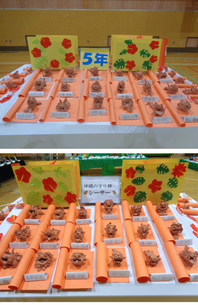 5年生は、「沖縄の守り神 シーサー」です。粘土で一人ひとり違うシーサーを表現し、運動会から続く沖縄の学習のまとめとして制作しました。