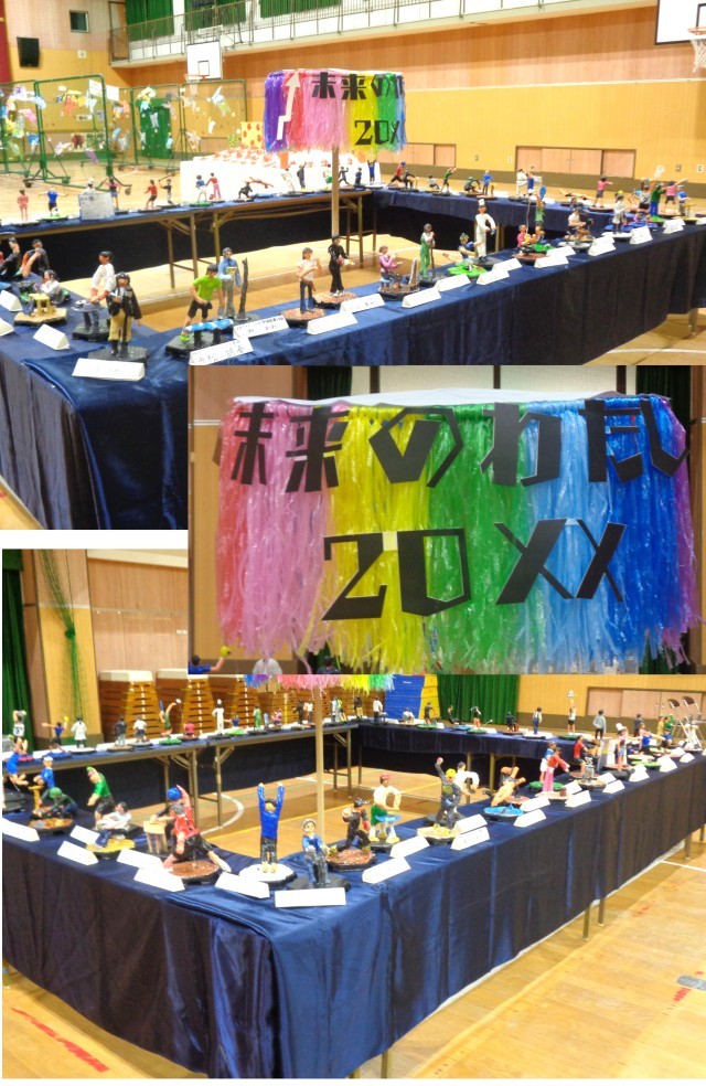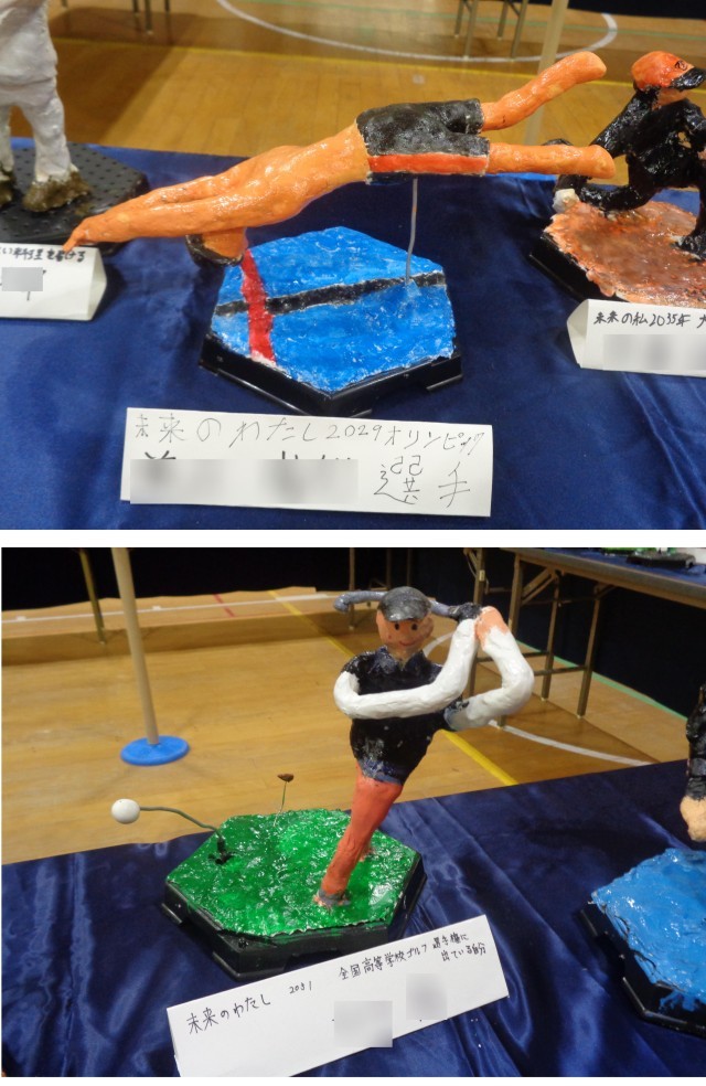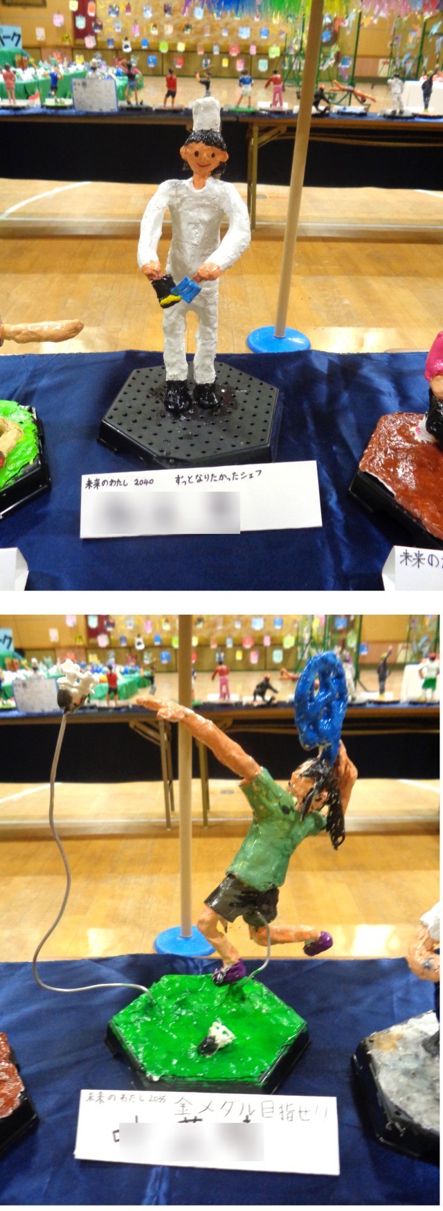6年生は、紙粘土に芯材を使った動きのある「未来のわたし 20XX年」です。将来の自分の夢を実現した姿を表現しています。