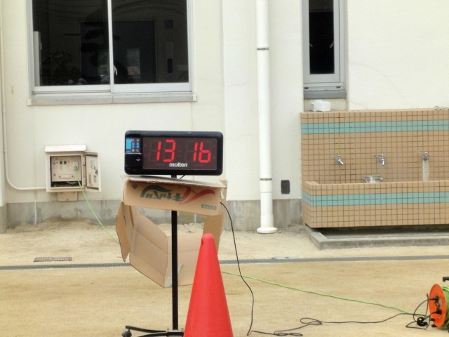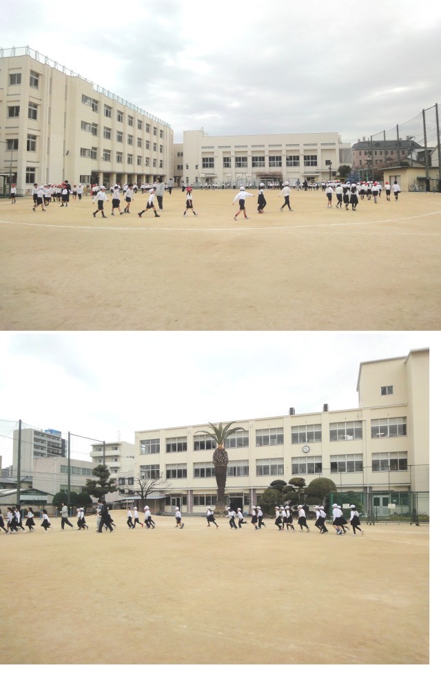 1月13日(火)、今日から「かけあしタイム」の実施です。初日は、1~3年生の低学年の部です。最初はクラスで並んで走りますが、途中から自分のペースで走っていきます。今年は2月2日(1.2年)2月3日(3年生以上)の「かけ足大会」では、個人のタイムを記録することになっています。「かけあしタイム」からタイムを意識できるように、指揮台の横にはタイマーも設置されました。