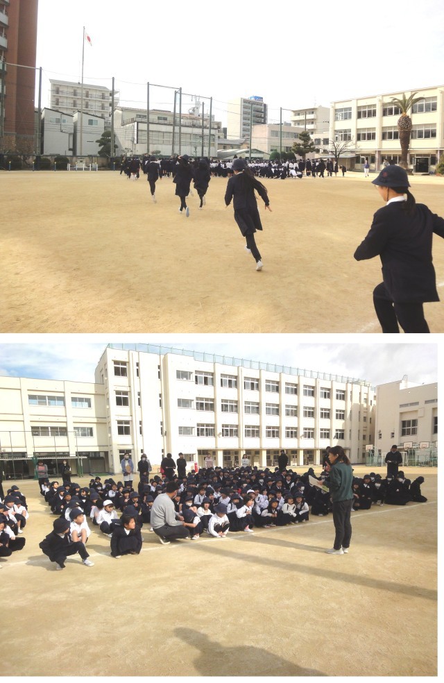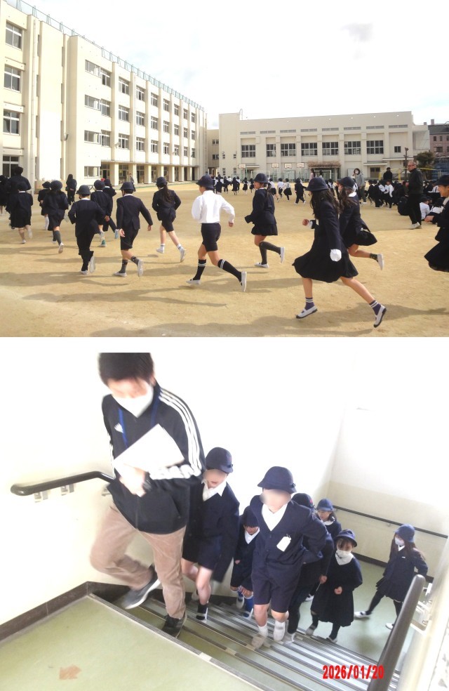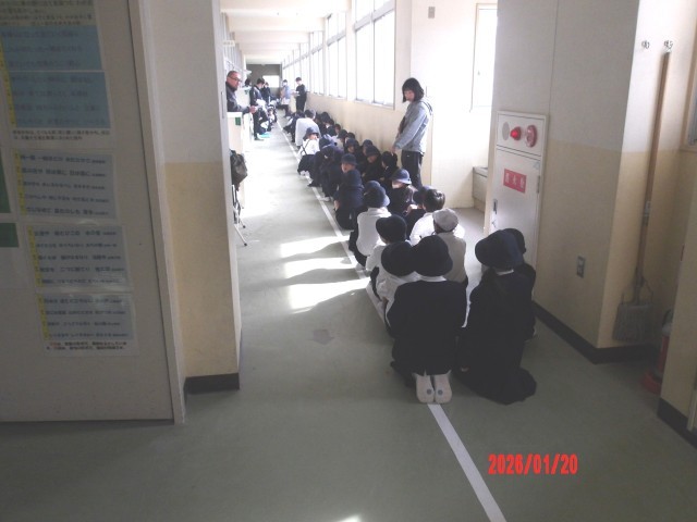 1月20日(火)3時間目、地震とそれに引き続く津波を想定しての避難訓練を行いました。最初に地震の揺れを想定して放送があり、子どもたちは、教室で机の脚をもって下にもぐり、揺れが収まるのを待ちます。揺れが収まったら、今度は校舎の外に避難します。そして、地震の後に津波が来ていることを想定して、再び校舎に入り、3階以上の高い場所に避難をします。