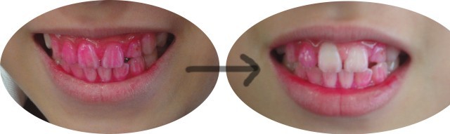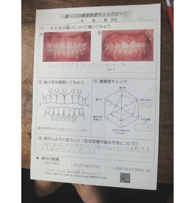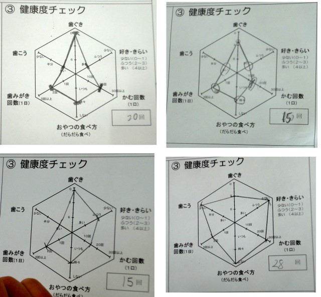 歯垢染色剤を使って歯の磨き残しをチェックした後、前歯2本だけを磨いて歯垢が落ちているのを確認しました。磨く歯をしっかりと意識することでていねいな歯磨きになることがわかりました。そして、歯周病は生活習慣病であり、日ごろのおやつの食べ方や噛む回数などを各自でチェックし、レーダーチャートで表すことで、自分の課題を知ることができました。