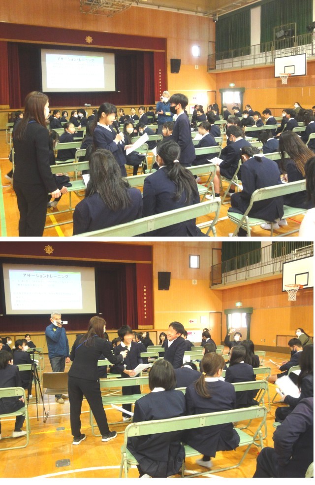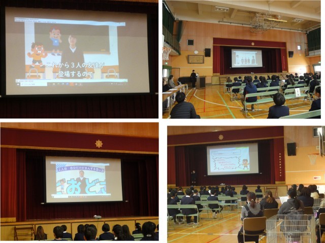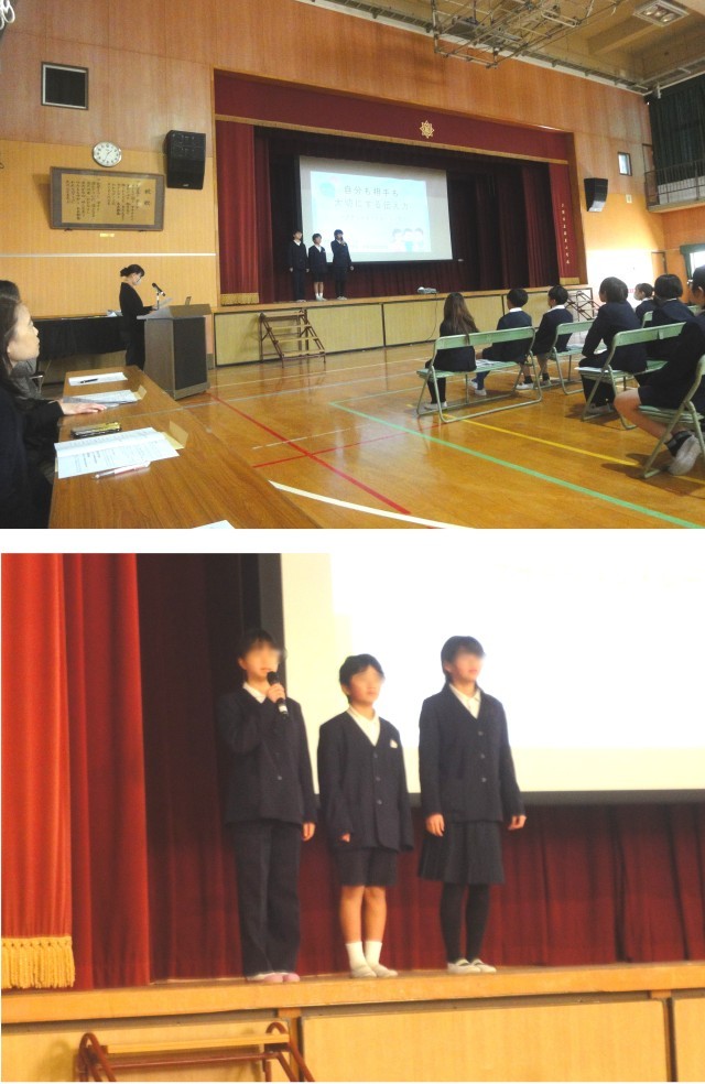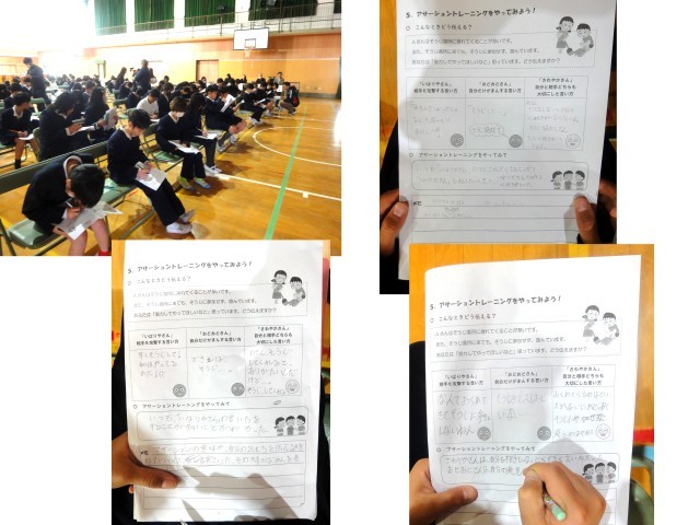 1月27日(火)、5時間目に「学校保健委員会」が講堂で開かれました。参加したのは、5年生・6年生の子どもたちと、PTAの方々、学校医・学校歯科医・学校薬剤師・スクールカウンセラー・教職員で、テーマは「アサーショントレーニング」。学校長のあいさつの後、保健委員会の子どもたちによる「アサーショントレーニング」についての説明ビデオが放映され、5.6年生みんなで①攻撃的な「いばりやさん」 ②非主張的な「おどおどさん」 ③アサーティブな「さわやかさん」の3つの言い方を考え書き出していきました。次にペアになって、自分が書き出した3つの言い方で相手に伝えてみました。伝えられた人は、どんなことを感じたか、アサーティブな言い方を学んでどう感じたか書き出しました。