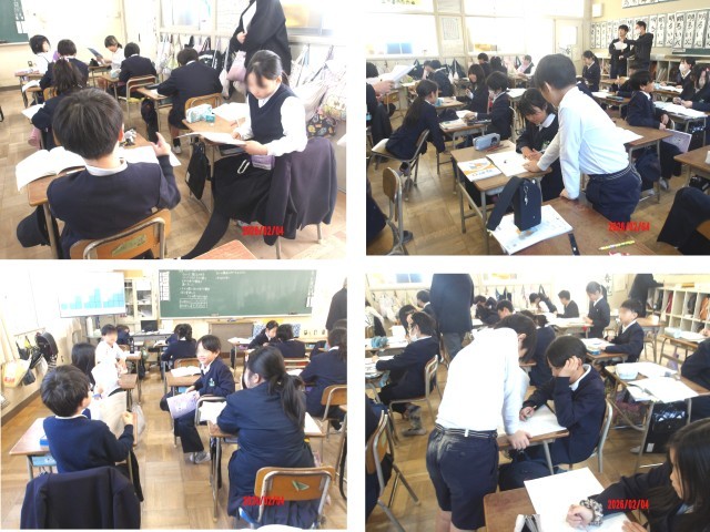 4年生の教室では、算数「変わり方」の授業が進められていました。正方形の階段の段の数と、周りの長さの関係を調べていく学習です。この時間は特別に担任が補助に回り、ベテランの教員が前に立って授業をしました。どの子も、意欲的に学習に取り組み、考えを出し合う話し合いの活動も普段通りできていました。丁寧な板書・机間巡視でどの子も学習内容をよく理解できていました。