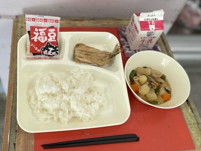 給食では、節分の行事献立として「いわしのしょうがじょうゆかけ」と「いり大豆」が出ます。
