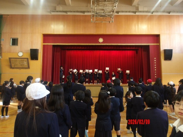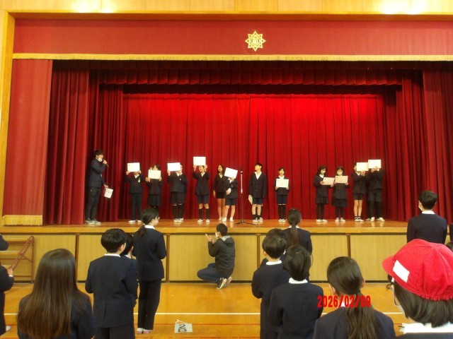 2月9日(月)児童集会の後、先日行われた「かけあし大会」の、各学級での1番速い記録を出した児童を男女別に表彰しました。そのうち、代表して6年生の最高記録を出した児童へは学校長から表彰を行い、それぞれの学年の児童へは、低学年と高学年に分けて運動委員会から賞状が渡されました。