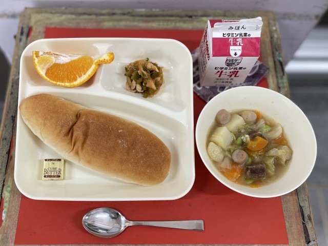 今日の給食のポトフは、牛肉やウインナー、じゃがいも、キャベツ、にんじん、えだまめを使用しています。