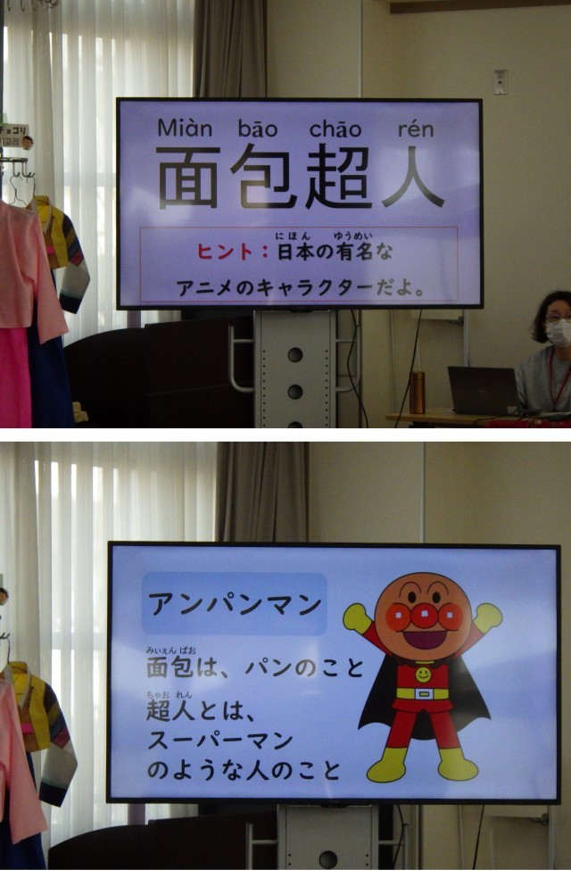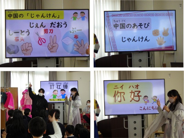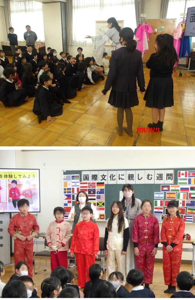 2月5日(木)~13日(金)までを「国際文化に親しむ週間」として、12日(木)と13日(金)の2日間で、中国の老师(先生)に来ていただき、中国出身の中国の文化を知る活動を全学年で行いました。中国のあいさつや、漢字の使い方で日本語と違っているものなど、言葉の学習から、じゃんけんの仕方なども教えていただきました。また、中国の民族衣装を着せてもらったりもしました。