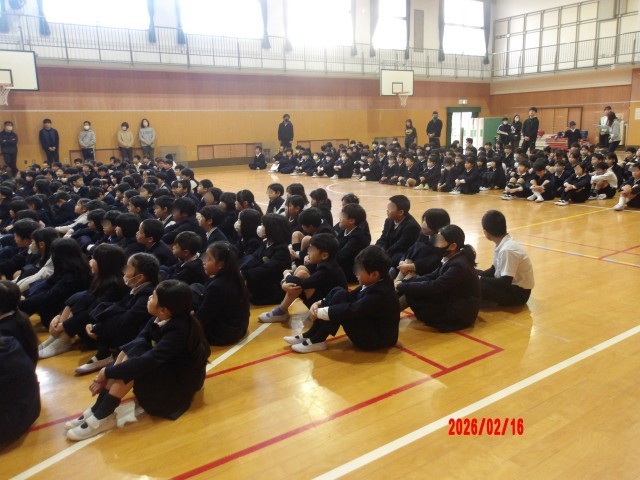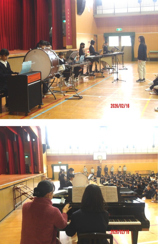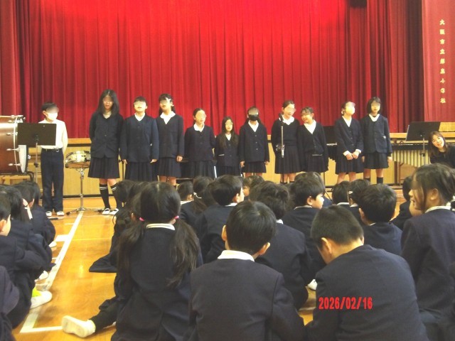 2月16日(月)、児童朝会の後、音楽クラブが日ごろの練習の成果を発表しました。リコーダーの演奏を2曲と、いろいろな楽器で合奏を1曲、そして歌の発表の後にはアンコールがあり、最後は聴衆といっしょに歌声を響かせました。