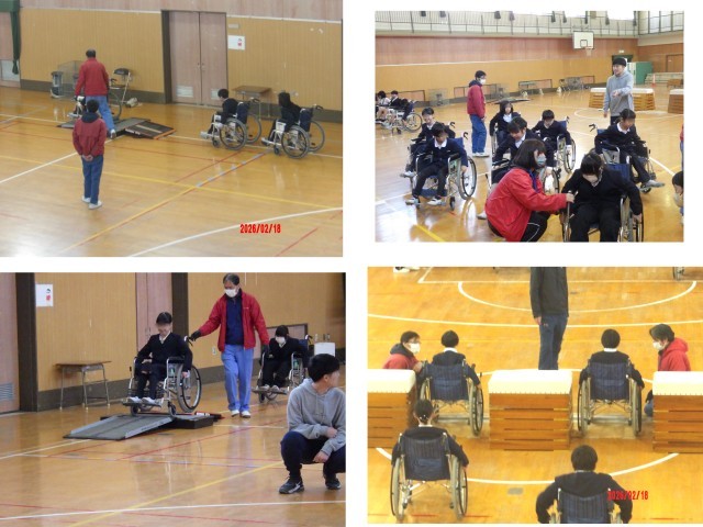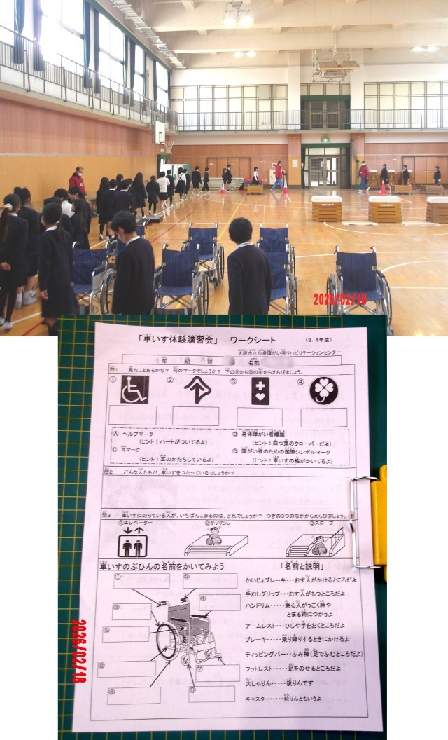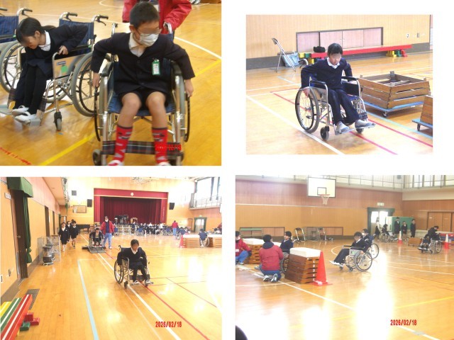 2月18日(水)、3.4時間目に、「リハビリテーションセンター」の方々にゲストティーチャーとしてきていただき、4年生が車いす体験をしました。3時間目は、体育館で車いすの構造や使い方について、実演をまじえて教えていただき、そのあと、一人で車いすを操作する自走のコースをまず、歩いてみました。歩いたコースを今度は、車いすを自分で操作する自走体験をしました。コースには段差や障害物なども設置されていて、歩いた時にはさほど苦労を感じない場面でも、実際に車いすを使うとたくさんの苦労があることに気づきました。子どもたちからは、「スロープがけっこうしんどかった。」という声がありました。