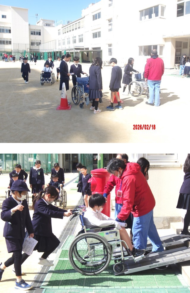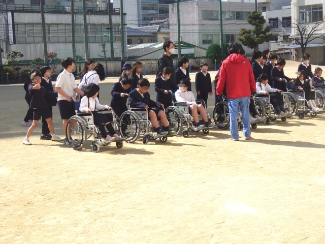 4時間目は、廊下や運動場を使って、車いすの介助の体験をしました。この活動では、「右に曲がります。」「段差があります。」といった車いすを押す人の声掛けが大切だということがわかりました。ここでも、「段差の上り下りに苦労した。」といった感想をもち、介助者の苦労を体験することができました。