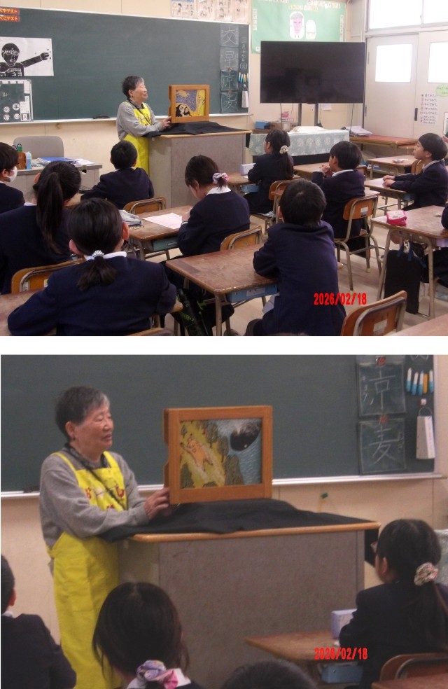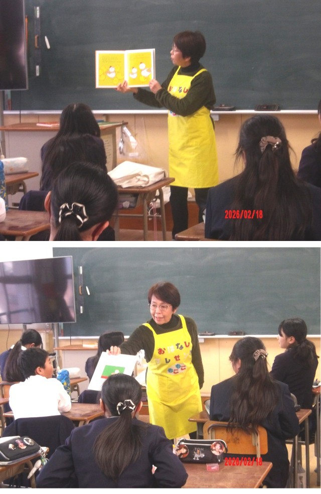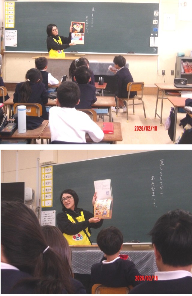 2月18日(水)、朝の時間では水曜日恒例の読書ボランティア「もこもこ」さんによる読み聞かせです。今日は、2年生と5年生の教室で、絵本を読んでいただきました。絵本は、お話を聞くだけでなく描かれてある絵も大切な中身です。読み手の方々は、紙芝居で絵を見せながらお話をしたり、机と机の間の通路に入り込んで絵本の絵を見ることができるようにしたりと、工夫して読み進めてくださっています。