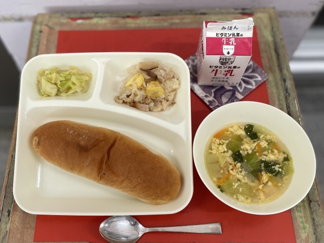 今日の給食は、焼き豚、栗、しいたけが入った「中華おこわ」です。