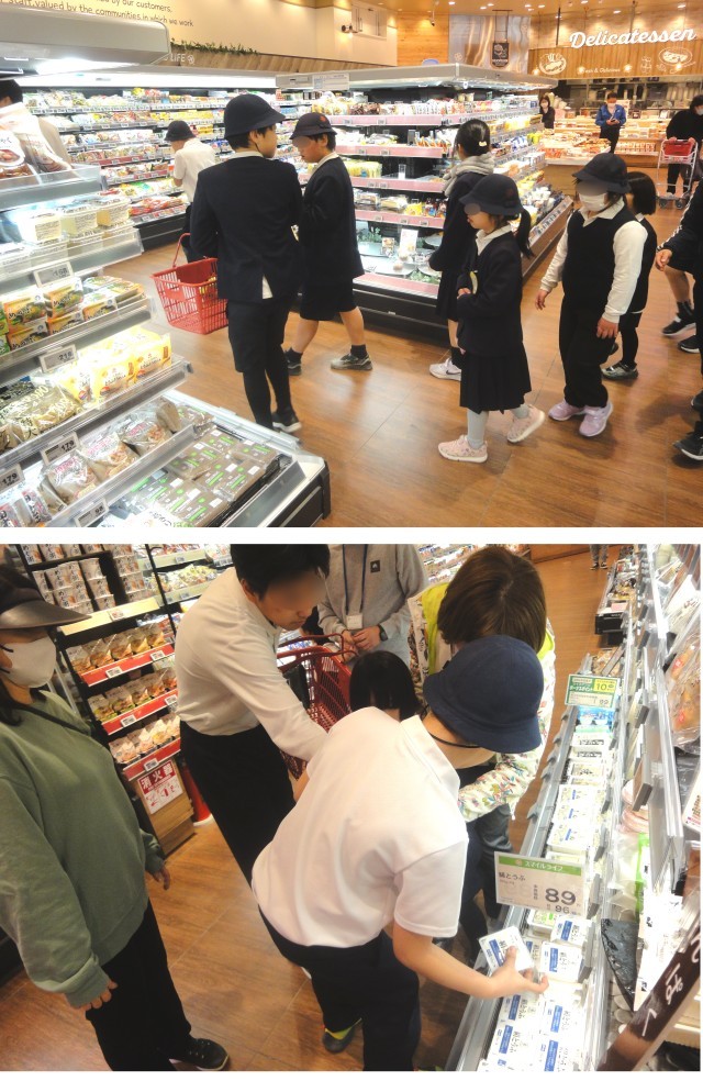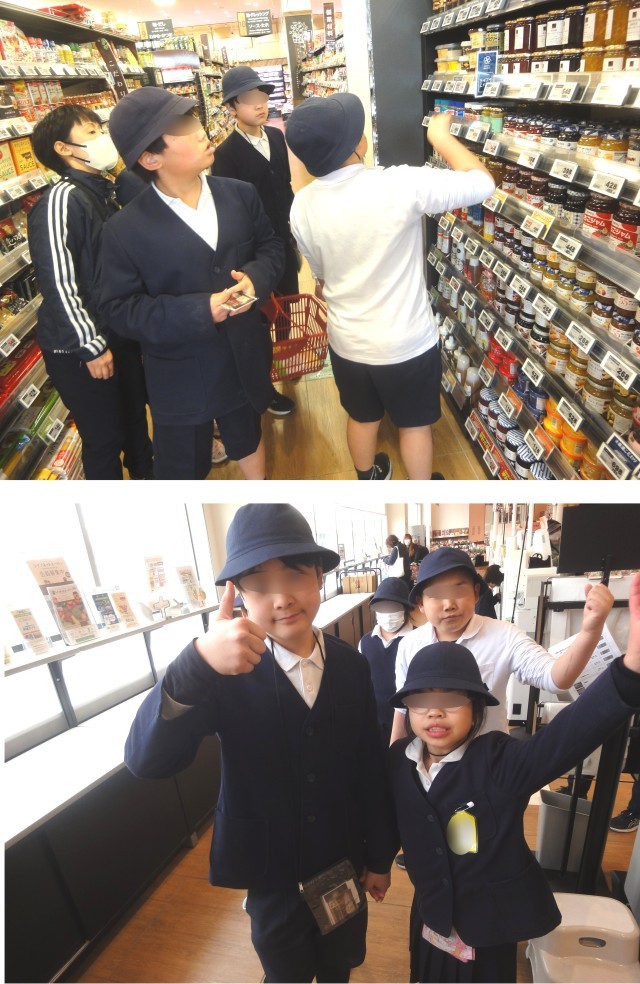ライフまでは、歩いて5分くらいですが、6年生が下学年の子どもたちに気を配りながら、車に気をつけて歩いていました。店に入ると、白玉粉とそれに混ぜる豆腐のほか、グループ決めた味付け用のあんこ・きなこ・フルーツ缶・黒蜜などを、グループごとに探していました。ここでも高学年が下学年をリードして買い物を楽しんでいました。セルフレジでバーコードを読み込ませるのもお手のもの、しっかりと買い物ができました。