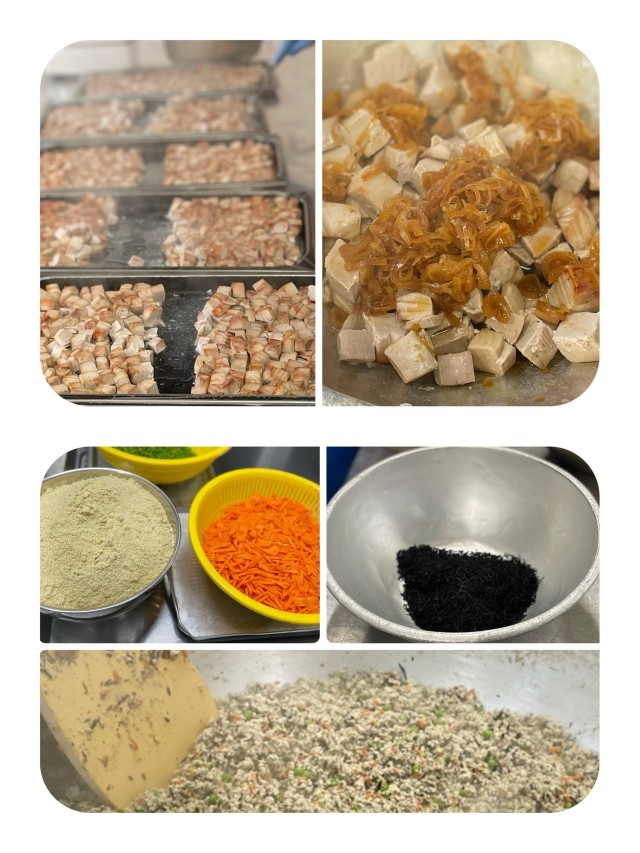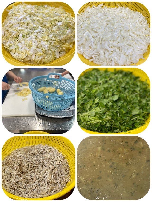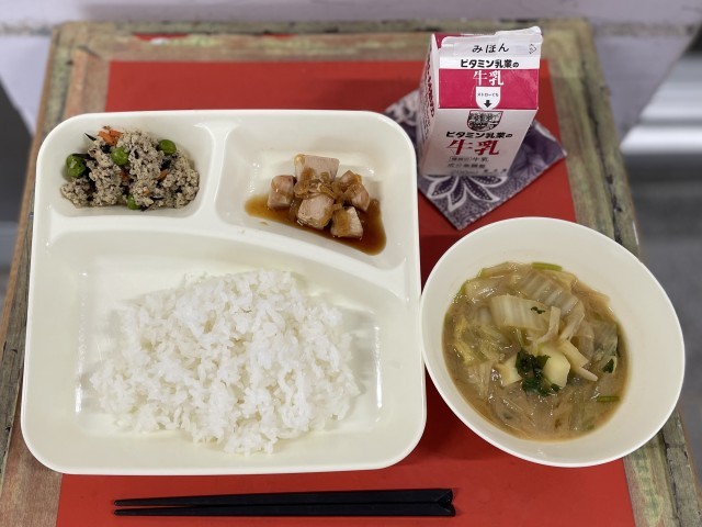 今日の給食の高野どうふのいり煮は、不足しがちな鉄を多く含む高野どうふの粉末を使用しています。豚ひき肉を加えて旨みをだし、にんじん、グリンピース、ひじきを加えることで彩をよくしています。ごはんによく合う一品です。