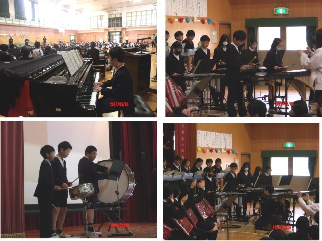 「卒業おめでとう集会」を開いてもらった6年生は、手作りの雑巾を各学級の代表に手渡しあと、お礼の意味を込めて「情熱大陸」を全員で合奏しました。迫力ある演奏に、在校生のみんなも手拍子で盛り上げていました。合奏後、6年生代表がお礼を述べていました。