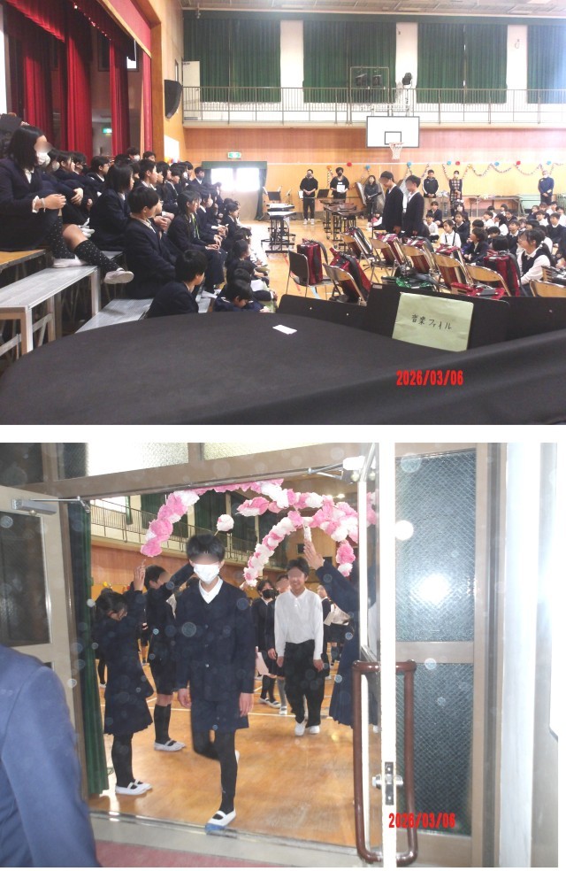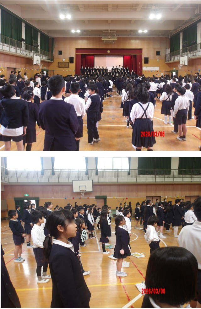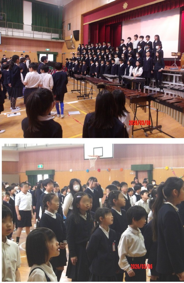 最後に6年生と在校生全員で「ありがとうの花」を合唱し、伸びのあるきれいな歌声が体育館に響いていました。