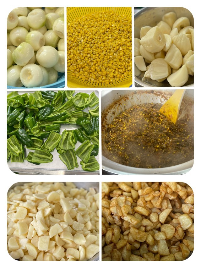 「フライドポテト」は、半月切りにしたじゃがいもに、塩こしょうで下味をつけ、油で揚げています。