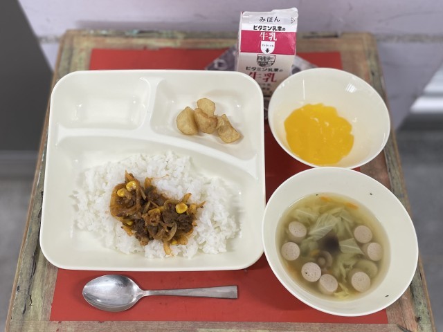 「ビーフケチャップライス」は、牛肉、たまねぎ、ピーマン、コーンをいため、ケチャップ、ウスターソース、塩、カレー粉で味付けした具をごはんにかけ、食べる前に混ぜ合わせます。子どもに人気のケチャップ味にしています。
