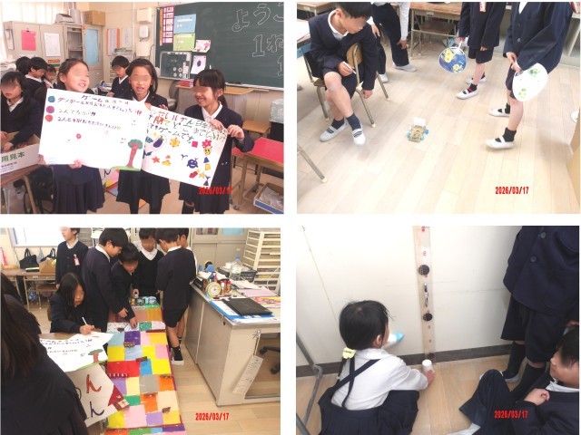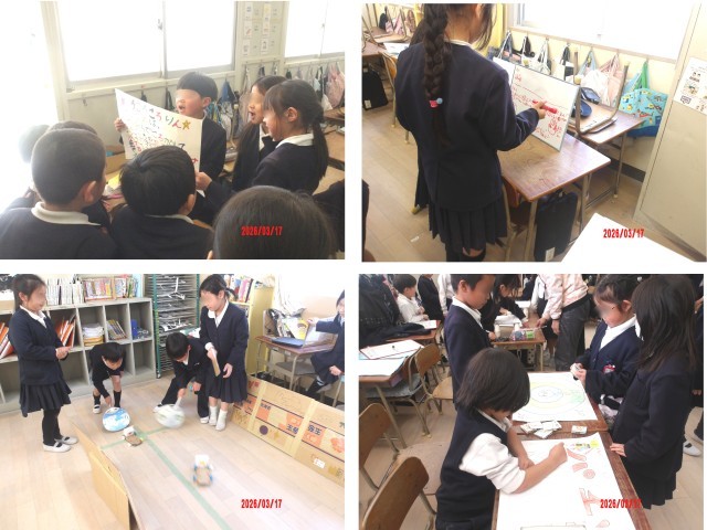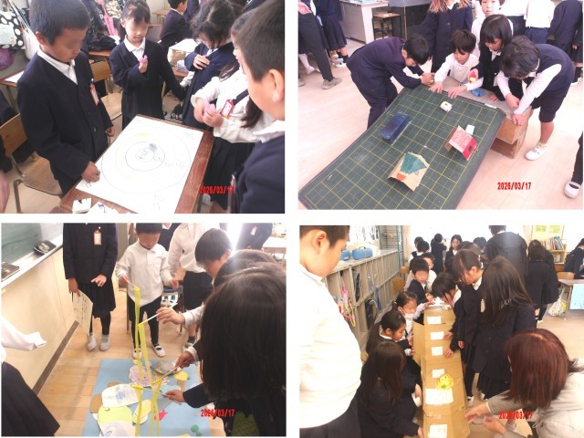 3月17日(火)、2年生が、生活科で作ったおもちゃを1年生にも遊んでもらおうと、教室に招待しました。おもちゃがたくさん並んだ教室では、2年生が遊び方の説明をしたり、やり方のコツを教えたり、遊んだ記録を書いたりして、楽しく過ごしてました。