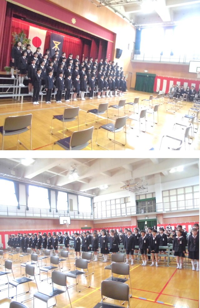 卒業証書を受け取った卒業生たちは、学校長式辞・PTA会長祝辞を聞き、いよいよ「門出のことば」を披露するためひな壇に整列しました。「門出のことば」の中には、5年生からの送る言葉があり、言葉と共にすばらしい声で「大切なもの」の歌が送られました。卒業生による言葉が、6年間を振り返り感謝の気持ちを伝える内容となるころには、涙をぬぐう多くの姿が見られました。最後に「旅立ちの日に」を歌う頃には、涙を気に留めずに懸命に歌う姿に心が打たれました。
