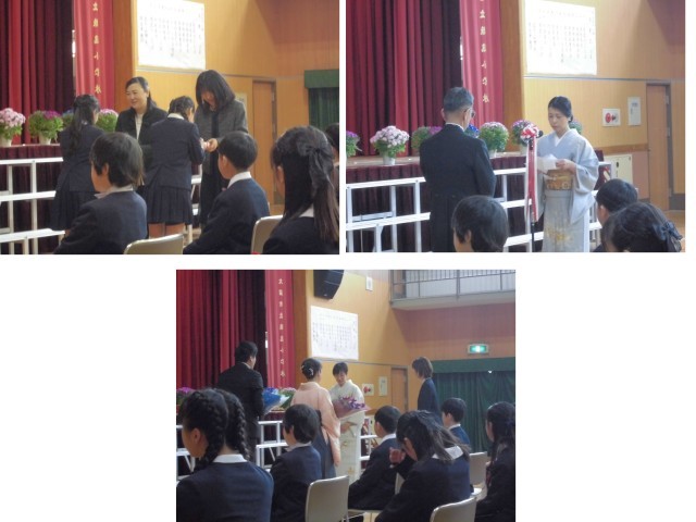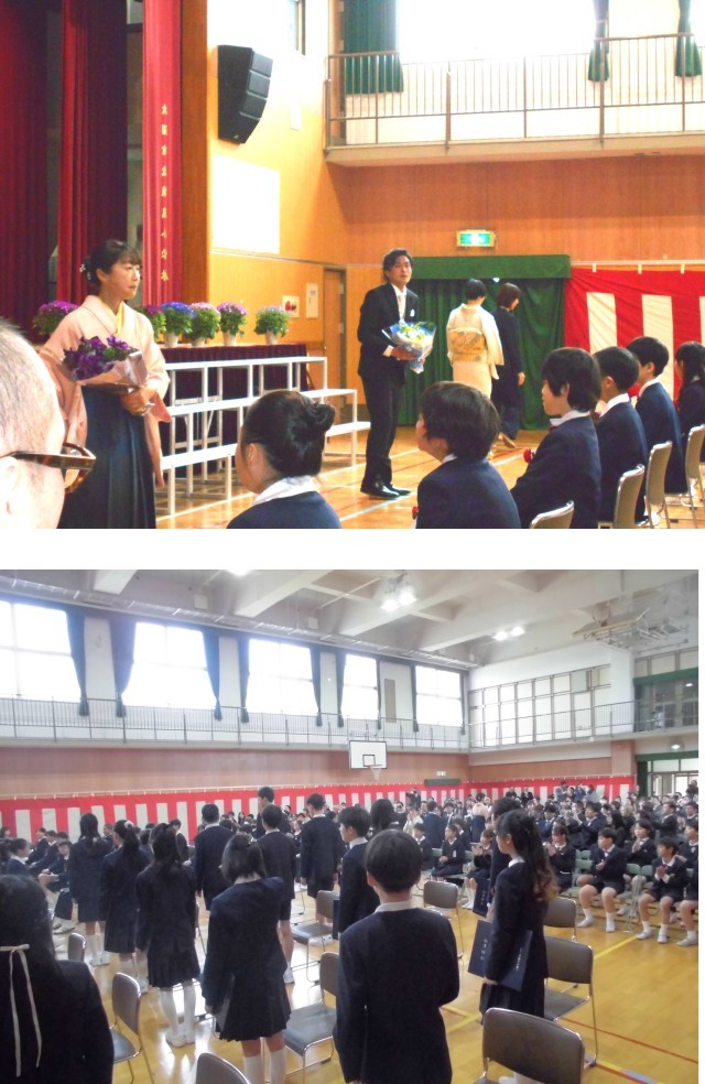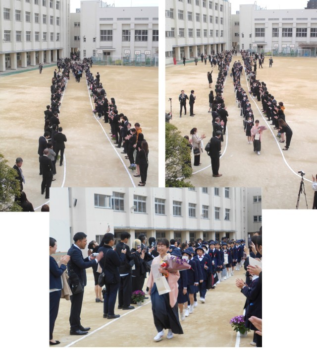 卒業式の後には、記念品の贈呈・保護者謝辞がありました。そして、卒業生たちは、保護者から頂いた花束を抱えた担任を先頭に教室に戻り、担任と最後のお別れをしました。担任との別れの後、卒業生はみんなの待つ運動場の花道を通り、学校に別れを告げました。