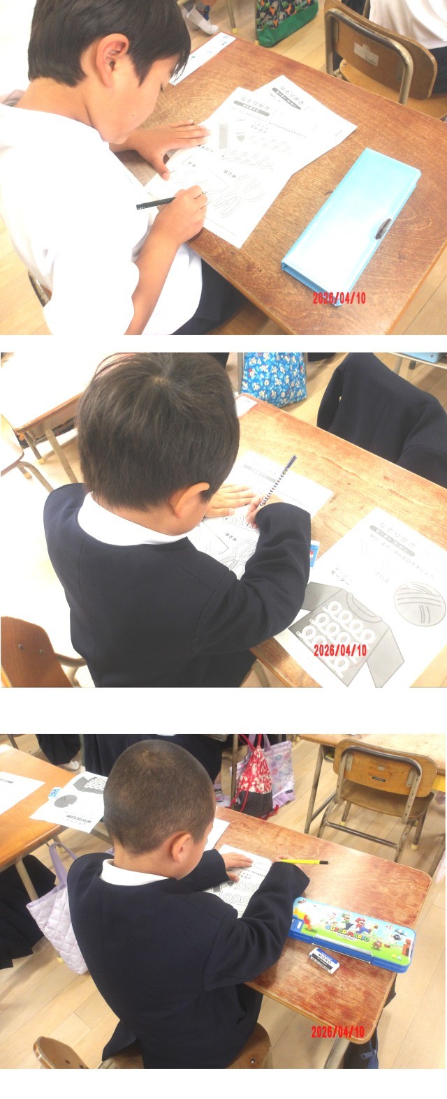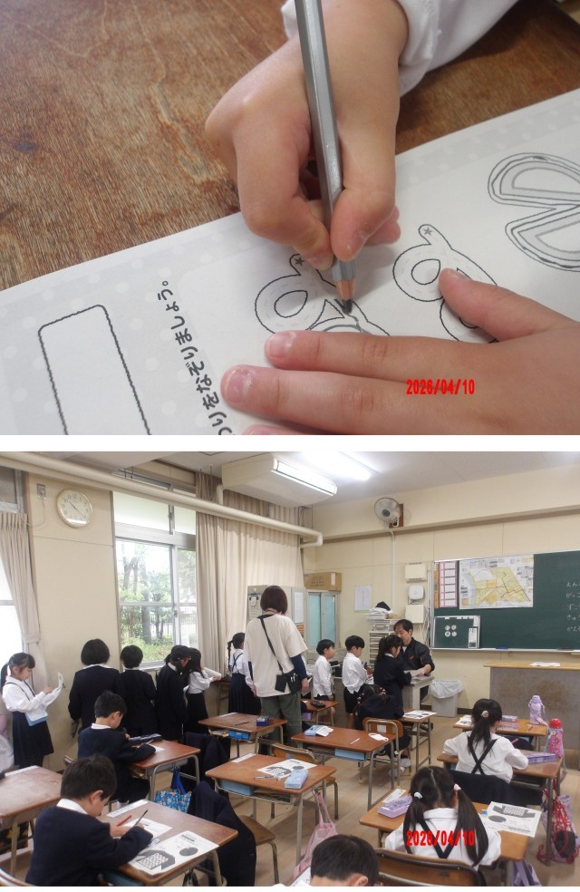 1年生の教室では、えんぴつの持ち方の学習をしていました。正しい姿勢で、正しいえんぴつの持ち方で線をなぞる学習です。担任先生が「ワークシートをやります」というと、子どもたちからは、初めて書く学習をすることに「やったー」という声もあがりました。