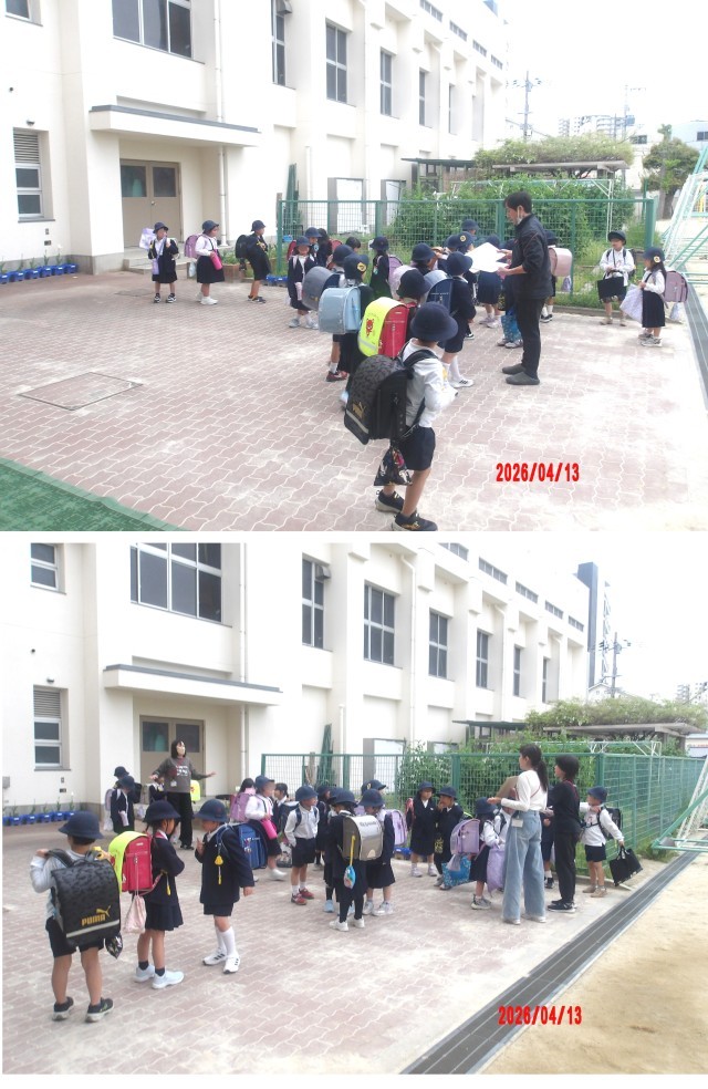 1年生が、下校の準備をしていました。持ち帰る物と学校に置いていく物を、教員が一人ひとりランドセルの中身を見て確かめていました。準備ができたら、靴を履き替えて外に出ます。外に出ると、下校方法・下校の方向などでグループに分かれ、いきいき活動に参加する児童は、いきいき活動の指導員がお迎えに来てくれています。ここまで、先週はとても時間がかかりましたが、1週間が過ぎた週明けの今日は、スムーズにできました。