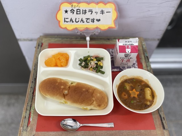 給食のビーフシチューは、牛肉、野菜を炒めて煮、ケチャップ、トマトピューレ、デミグラスソース(米粉)、トンカツソース、チキンブイヨンなどで味付けして煮込み、上新粉でとろみをつけています。