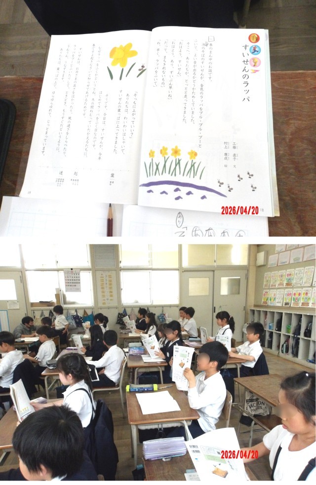 4月20日(月)、3年生教室では国語の学習で「すいせんのラッパ」の音読に取り組んでいました。一人一人が一文ずつ、順番に音読していきます。