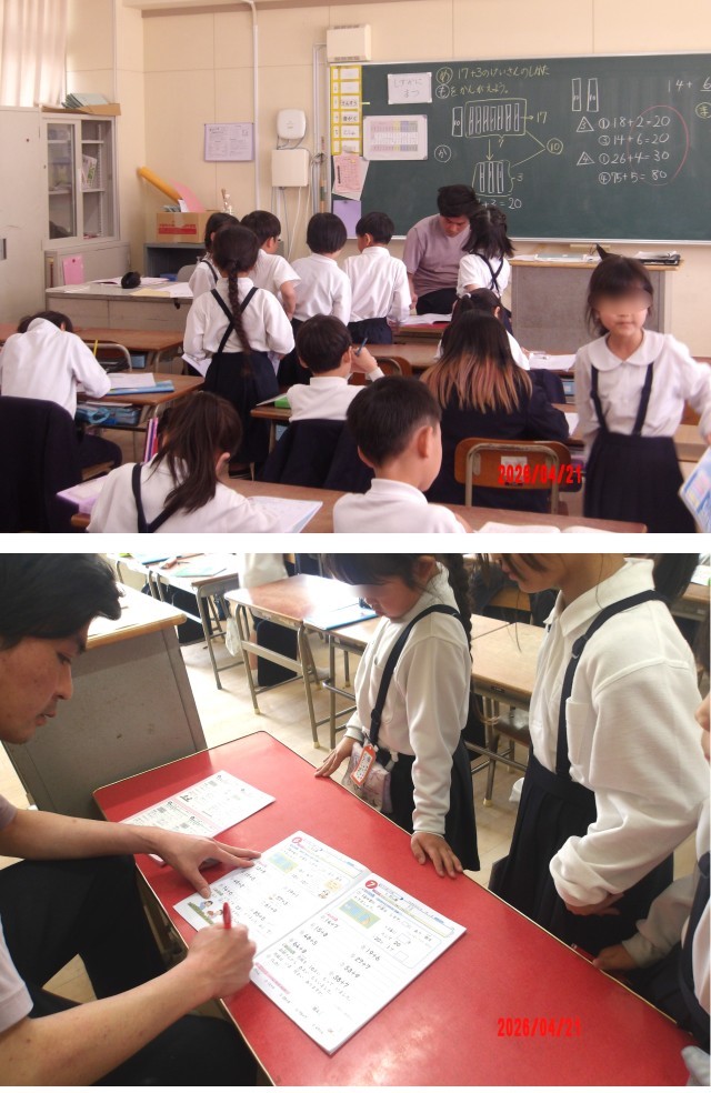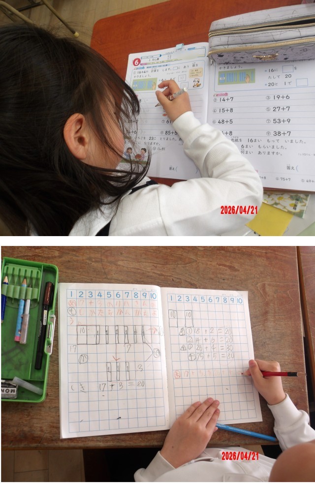 2年生の教室では、算数の学習を進めていました。今日は、2ケタ+1ケタのたし算で、1の位が10になるたし算です。1の位のたし算でできた10と元あった10で、答えが20になることを学習しました。