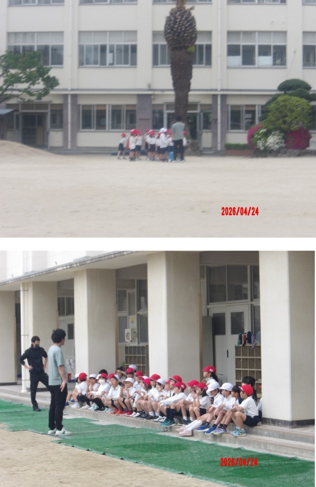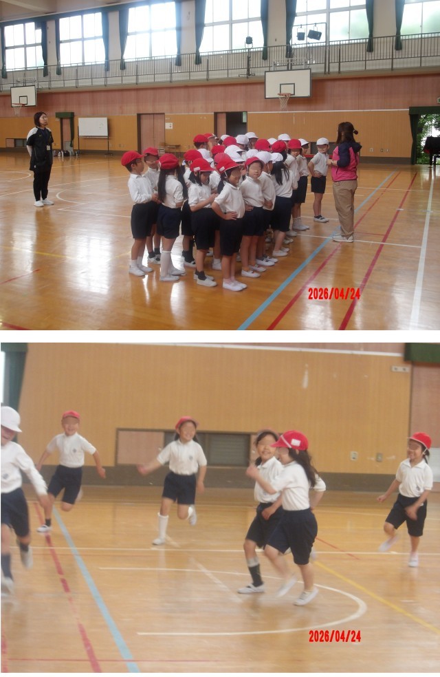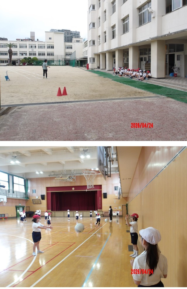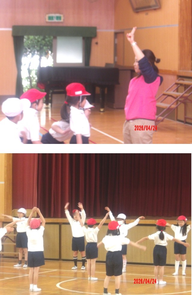 2年生が2時間目に、1組は体育館で2組は運動場で体育をしていました。どちらの組も準備体操は、体育係がみんなの前に立って、大きな声を出して体を動かしていました。