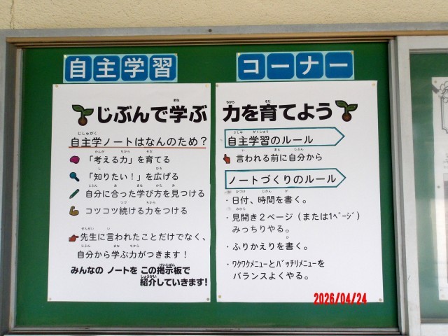4月24日(金)、年度初めの自主学習ノートの掲示板は、自主学習ノートに積極的に取り組めるように、何のために自主学習ノートをするのかや、低中高学年ごとに、どのようなテーマで進めたらよいのかなどをお知らせしています。