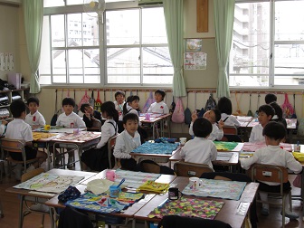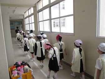 給食当番の準備も早くなりました。待っている子たちも行儀よく座っています。