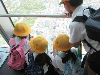 あべのハルカスでは、想像していたよりも高い位置から大阪市を眺めることができたようで、はじめは怖がっている児童もいましたが、馴染みのある建物などを見つけるうちにどの児童も興味津々といった様子になり、知っている建物を探そうと一生懸命に目を凝らしていました。