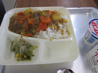 昨年度も何度かご紹介しましたが、今年度も4月から「ラッキー人参」が登場しています。写真のカレーライスの上の人参、何の形かわかりますか。他にもいろいろな形がありましたが、子どもたちはうまく見つけることができたでしょうか。人参が苦手な子どもたちは多いと聞きますが、苦手なものでも楽しく美味しく食べることができるようにと、調理員が工夫をしています。栄養をしっかりと摂って、健康で丈夫な身体に育つとともに、毎日の学習や活動に励んでほしいものです。