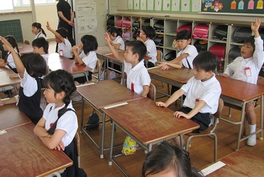 元気に楽しく活動しながら、英語の表現に慣れていくことから始めています。