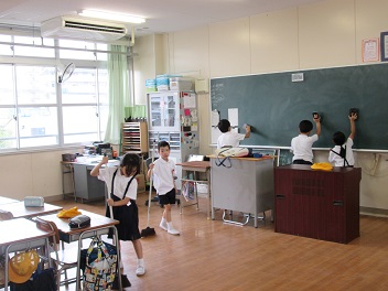 児童数の少ない本校では、毎日の掃除時間だけでは学校全部をそうじすることができません。普段はなかなか行き届かないみんなで使う場所を、異学年同士が協力してきれいにする取り組みをしています。