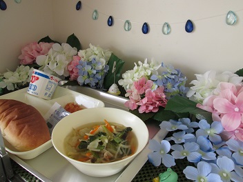 調理員による手作りディスプレイ、6月は紫陽花です。美しい花々の中に、今日の給食がおいしそうに映えています。じっと見入っている児童もいました。まだまだ月半ばですが、来月はどんなふうになるのだろうと楽しみが増えます。考えて飾る方は大変かもしれませんね。