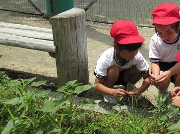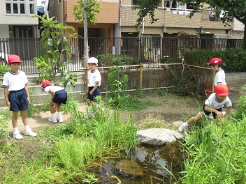 休み時間、ビオトープでは、1年生がいろいろな生き物や植物に興味をもって観察していました。何かを発見したようですね。