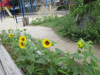 日中の気温が高くなってきて、すでに夏の訪れを感じますが、校庭に「ひまわり」の花が顔をのぞかせはじめました。まだまだかわいらしい赤ちゃんひまわりといった感じです。