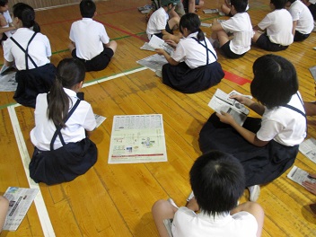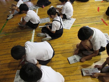 地震で床にガラスなどが散乱した時に役立つ「新聞紙」スリッパを作っています。
