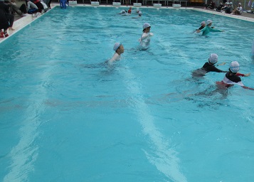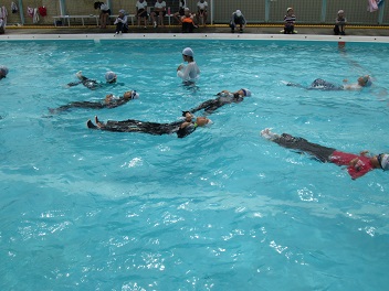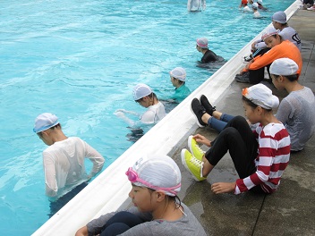 服を着ていると、水の中を歩くのも、プールサイドに上がるのも、なかなか大変だということを学んだようです。泳ぎの得意な子も、なかなか前に進みません。