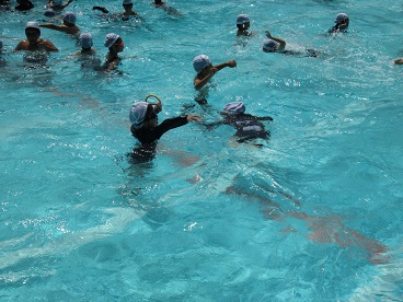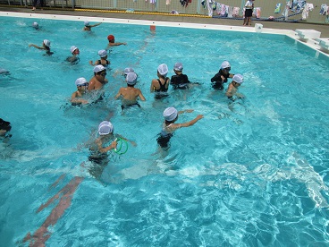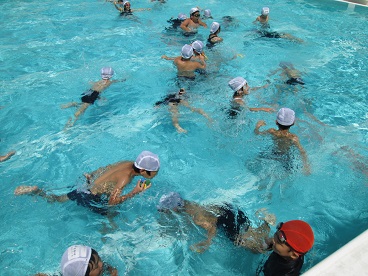 低学年は、1・2年生合同でプールに入っています。泳ぐ練習をした後は、ゲームを通してお互いに交流をしました。運動会にも合同で取り組む1年生と2年生、日々の活動をとおして絆を深めていってほしいものです。