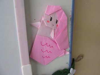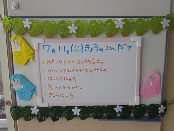 暑い日は食べづらく感じる時もあるでしょうが、給食室では楽しい雰囲気で子どもたちを迎える準備をしています。人魚も折り紙の手作りです。