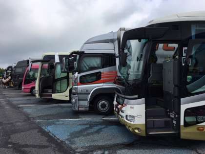 赤松saでトイレ休憩です。ものすごく沢山の林間バスが来てます。バスを間違えないように戻ってきてね!